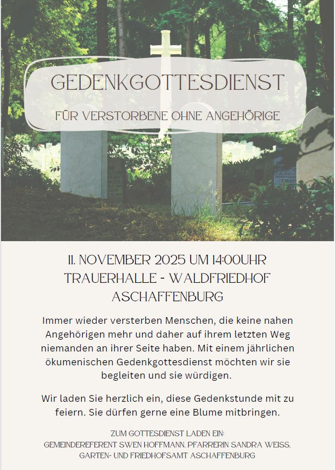 Der erste ökumenischer Gedenkgottesdienst 11. November um 14 Uhr in der Trauerhalle auf dem Waldfriedhof