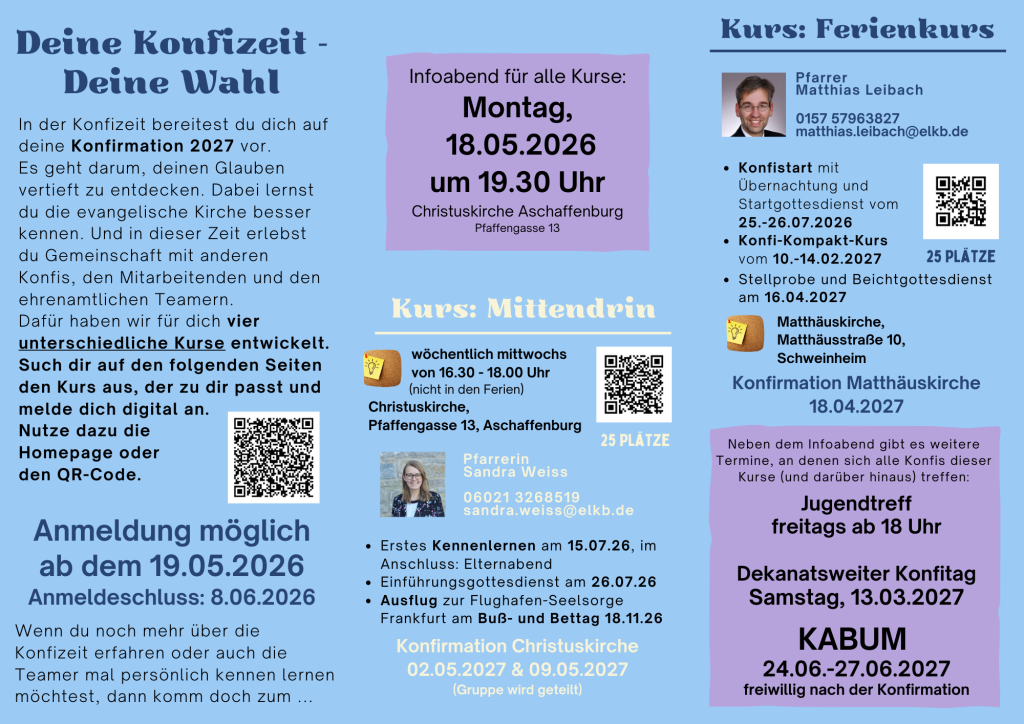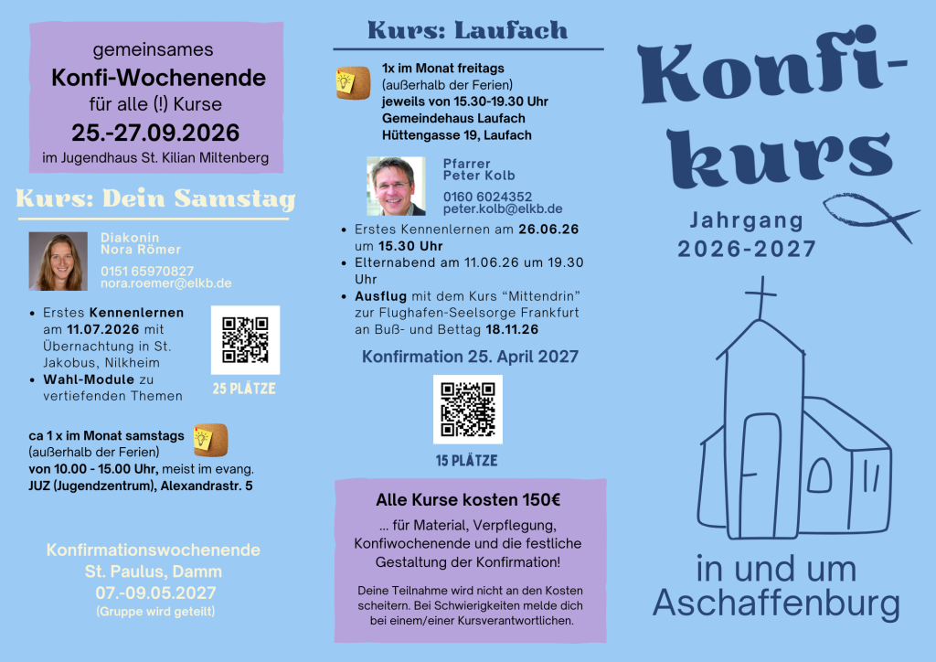 Die meisten Konfis sind ca. 13 Jahre alt. Wenn du Interesse hast, komm gerne zum Infotreffen für Eltern und Jugendliche am Montag, 18.05.2026 um 19.30 Uhr in die Christuskirche. Hier stellen wir dir vier verschiedene Kurse in und um Aschaffenburg vor, aus denen du wählen kannst. Auch wenn du noch nicht getauft bist oder viele Fragen und Zweifel mitbringst, bist du im Konfikurs genau richtig!